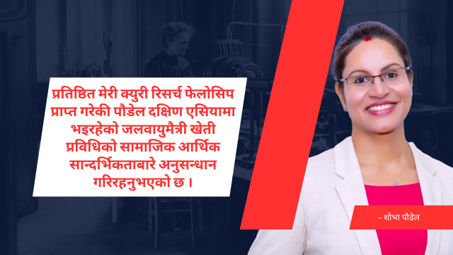 जलवायु परिवर्तन र खाद्य सुरक्षाका क्षेत्रमा लामो समयदेखि अनुसन्धानरत डा. शोभा पौडेल प्रतिष्ठित मेरी क्युरी (म्याडम क्युरी) रिसर्च फेलोसिपका लागि छनोट हुनुभएको छ । दक्षिण एसियामा भइरहेको जलवायुमैत्री खेती प्रविधिको सामाजिक आर्थिक सान्दर्भिकताबारे अनुसन्धान गर्न उहाँलाई यो फेलोसिप प्रदान गरिएको हाे । पौडेलले अहिले इटालीको मिलन सहरमा रहेर अनुसन्धान गरिरहनुभएको छ ।