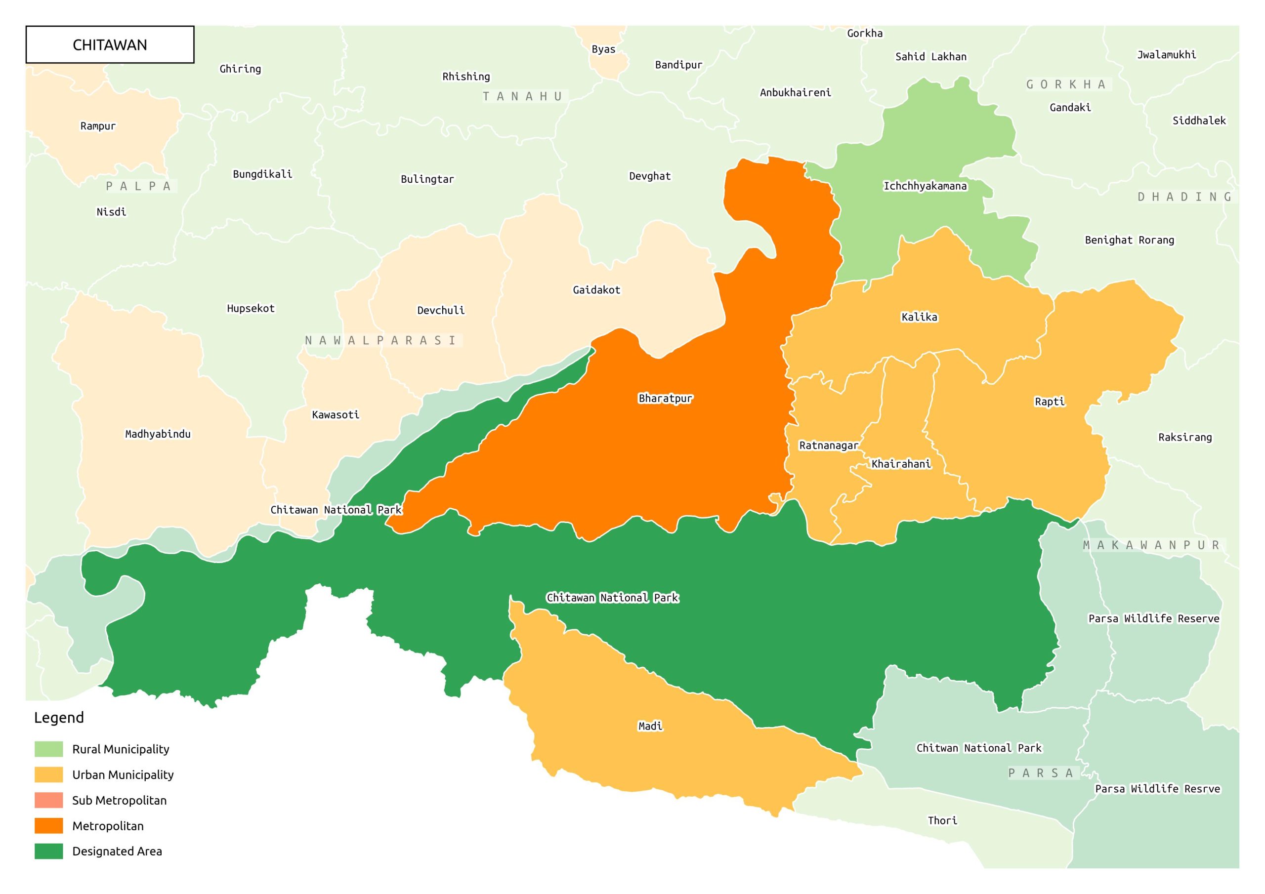 चितवनमा भरतपुर महानगरपालिकासहित रत्ननगर नगरपालिका, खैरहनी नगरपालिका, राप्ती नगरपालिका, माडी नगरपालिका, कालिका नगरपालिका र इच्छाकामना गाउँपालिका छन् । गएको स्थानीय तह निर्वाचनमा जिल्लाका ७ मध्ये एमालेले चारवटा नगरपालिका प्रमुख र पाँच जना उपप्रमुख जितेको थियो ।