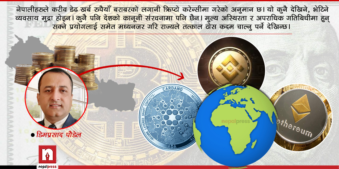 अहिले करिब १५० अर्ब अर्थात डेढ खर्ब रुपैयाँ बराबरको लगानी नेपालीहरुले क्रिप्टो करेन्सीमा गरेका छन् ।